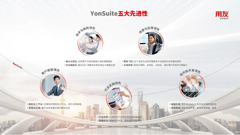 Yonyou YonSuite and Yonyou BIP have the same root and origin, based on the same base, and have five advanced features: technology and architecture, scenarios and applications, user experience, industry practice, and low-code development, and use this as support to provide the world’s leading pure public cloud SaaS integrated services for growing enterprises.